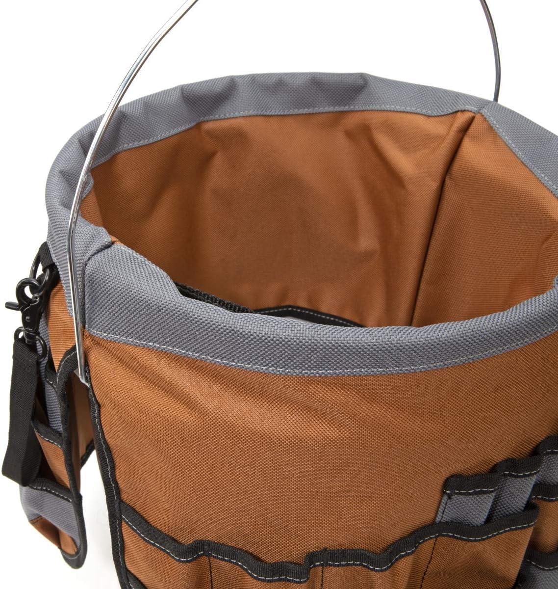 Get more work done with the Dickies Work Gear 57103 35-Pocket Bucket Organizer with Drill Holster. Constructed of heavy-duty gray and tan colored canvas, this organizer can easily hold all of your tools while you're working. Designed to fit over a standard-sized 5-gallon 12-Inch bucket, this organizer features 35 various compartments to maximize tool storage. Once slipped over the bucket, the organizer allows access to the interior for storage of larger items. On the exterior there are 10 large pockets, 14 medium sized pockets, 11 slip pockets, a drill holster, and a tape tether. Optimize your work space and add this bucket organizer to your collection!