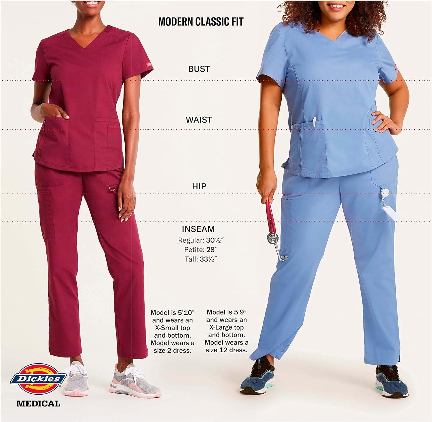 Dickies EDS Signature Nurse Scrubs for Women | Classic Elastic Waist Styling Medical workers are passionate, tough and strong. Made with these workers in mind, Dickies EDS Signature scrubs have the strength and endurance to stand up to multiple wears on the job and many washes in between. Our Modern Classic fit uniform scrubs for women are constructed of a soft and durable cotton/polyester blend poplin fabric. These natural rise women's pants feature an all-around elastic waistband and tapered leg. There is a total of seven pockets so you have plenty of room to store your gear: two roomy front slash pockets, two cargo pockets with stretchy knit interior pocket inside right cargo pocket. (Knit pocket is red on all colors except white. White pants have a white knit pocket.) Right cargo pocket features layered accessory pockets and logo twill tape instrument loops for additional storage. Pockets are large enough for iPhone and Galaxy phones. Woven iconic red Dickies horseshoe label on right cargo pocket. Plus size scrubs for women available. For cargo pants women will love, shop the entire Dickies EDS Signature collection. Dickies EDS Signature: Tough and strong, get the job done in Dickies EDS Signature scrubs. Modern Classic fit 55% cotton / 45% polyester brushed poplin Regular inseam = 30 ½” Petite inseam = 28″ Tall inseam = 33 ½”