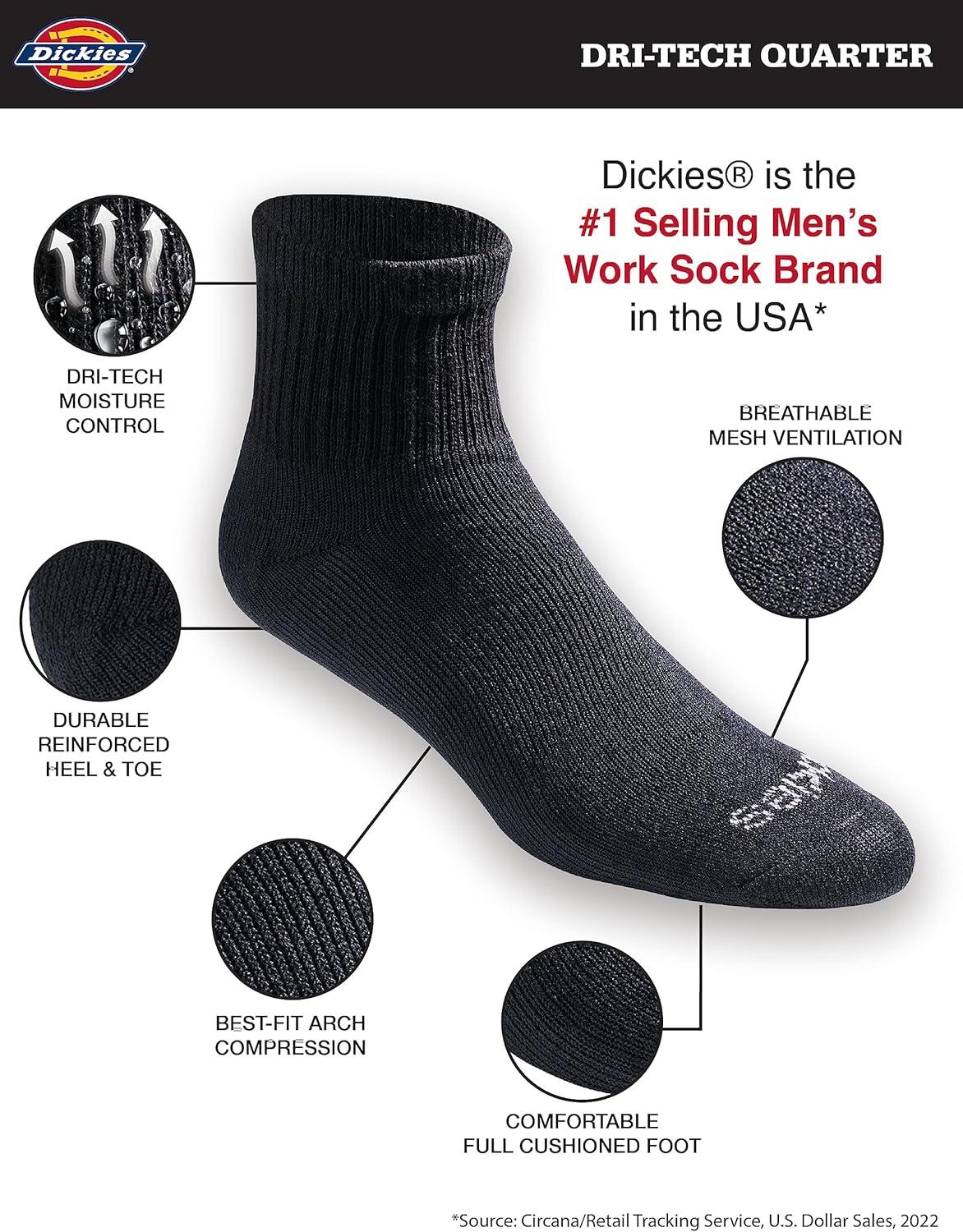 Dickies Men's Dri-tech Moisture Control Quarter Socks Multipack with wicking, moisture management fibers keeps feet dry, ventilation channels engineered for air circulation and moisture control, arch compression hugs feet and keeps socks in place, while providing in-step support, Reciprocated heel and toe for superior fit and full cushion comfort.