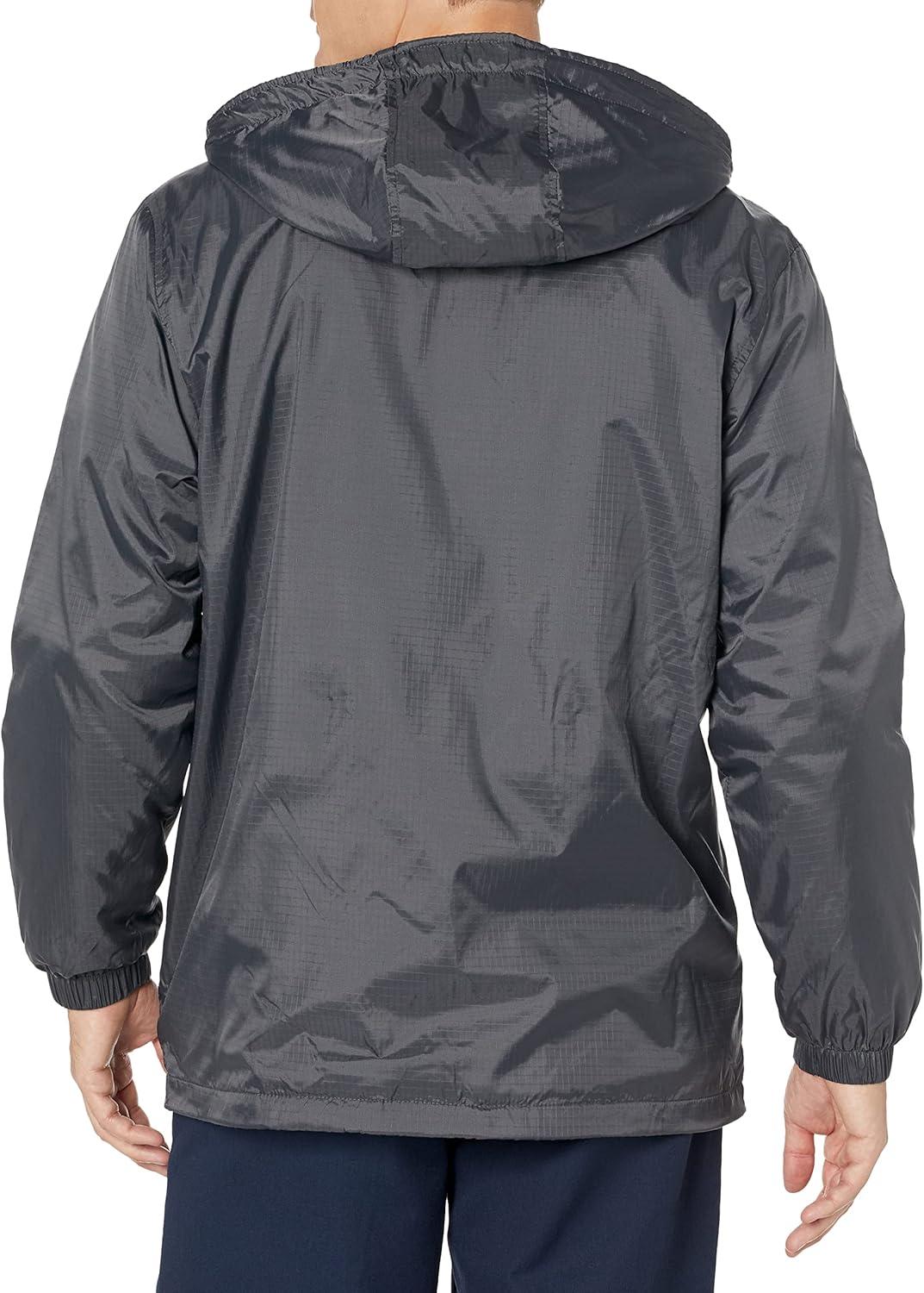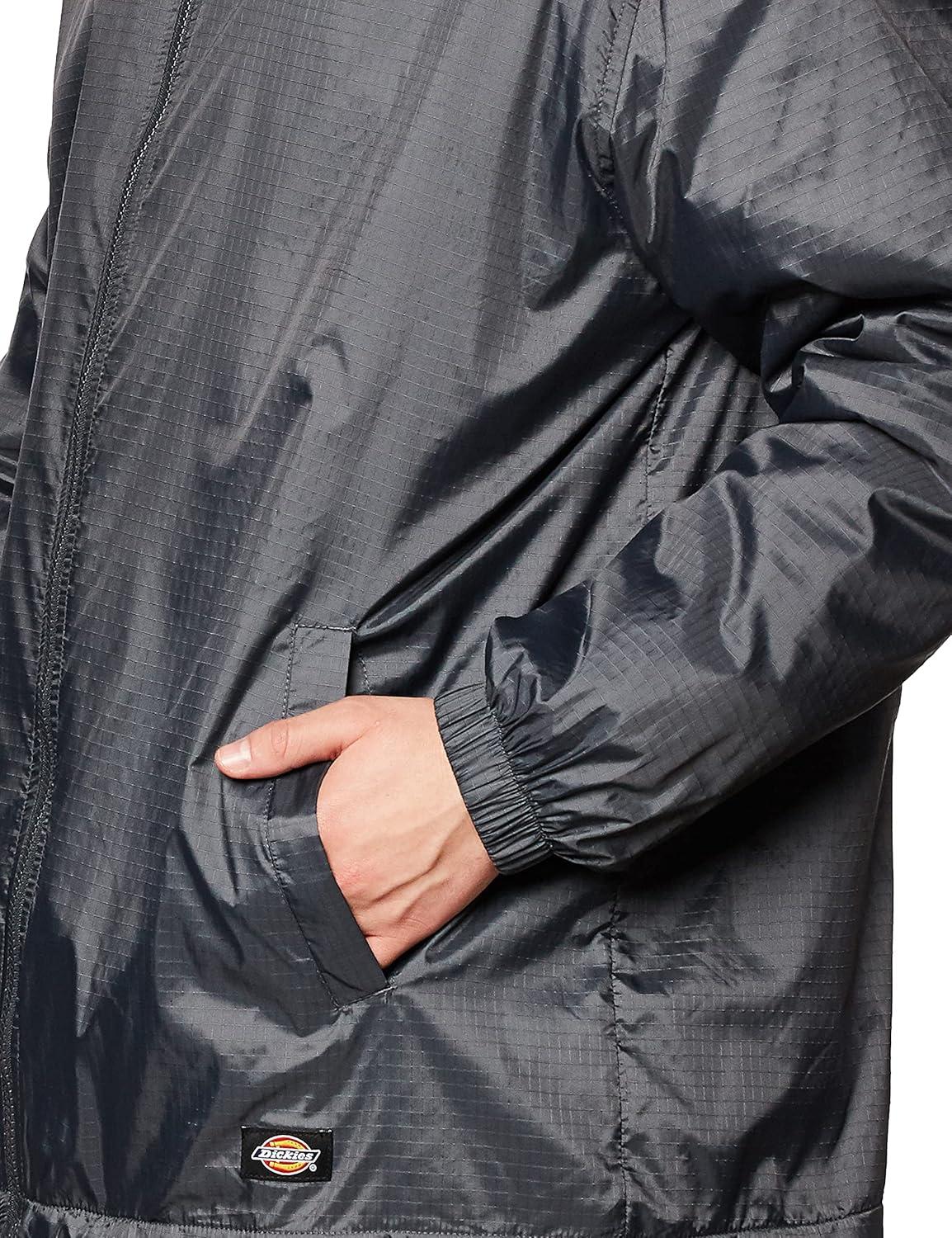 Dickies fleece lined nylon hooded jacket is a 100 percent rip-stop nylon with polyurethane coating and DWR finish for water resistance. It is fully lined with slash front hand warmer pockets and one inside pocket.