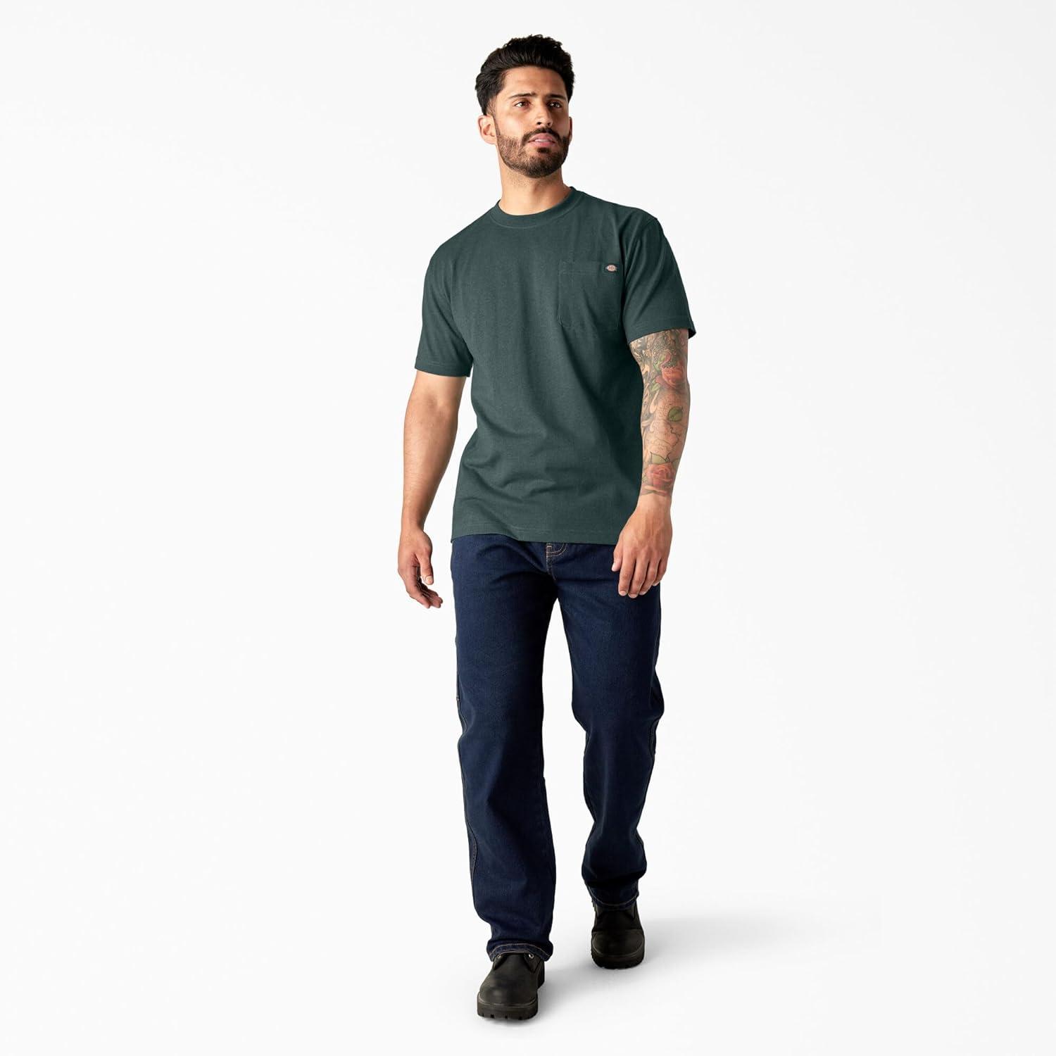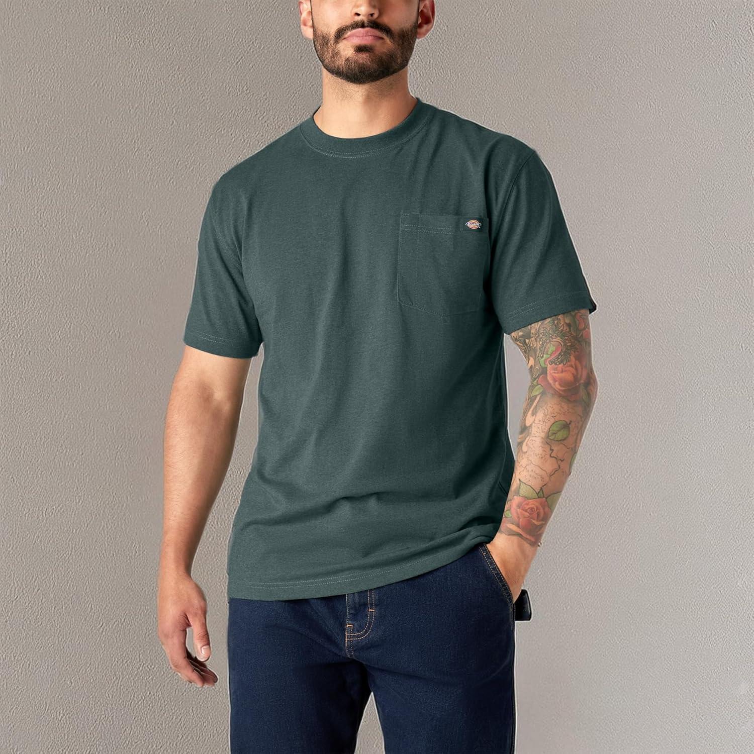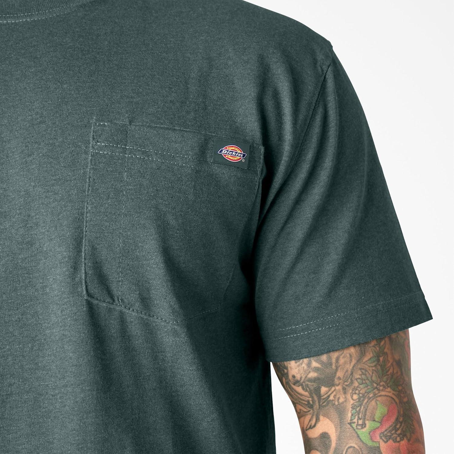 Dickies Men's Heavyweight Heathered Short Sleeve Pocket T-Shirt is a long-lasting workplace tee. Get the job done thanks to this durable heavyweight heathered cotton/polyester blend that stays comfortable throughout the workday and beyond. Store writing tools in its chest pocket with pencil divider, finished with a Dickies logo. The reinforced neck and shoulder seams are built to last, while the tagless neck label ensures an even more comfortable fit so that you can focus on the task at hand. Wear it alone or as a layer.