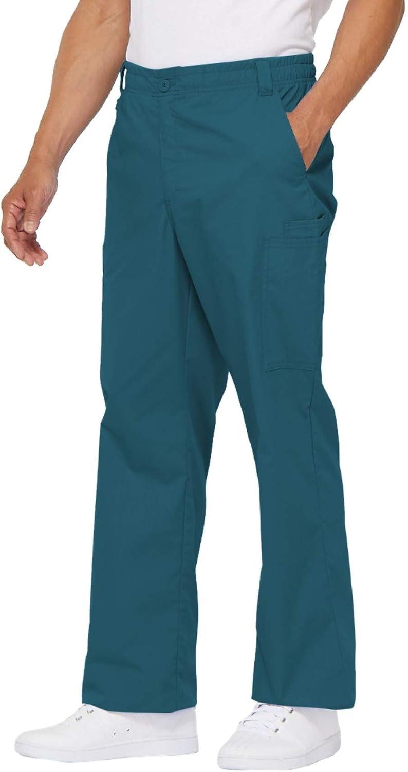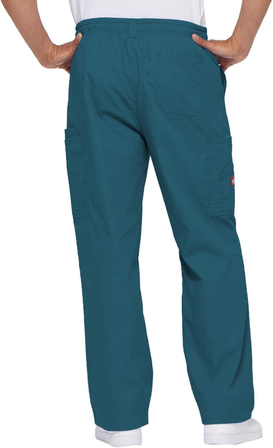 Men's zip fly pull-on pant features an all around elastic waistband with a button closure, an adjustable interior drawstring and Dickies logo twill tape on the inside back waistband. Also featured are slash pockets, cargo pockets and a back pocket with a hook and loop fastener for security, a d-ring on right front belt loop and double-needle topstitching throughout.