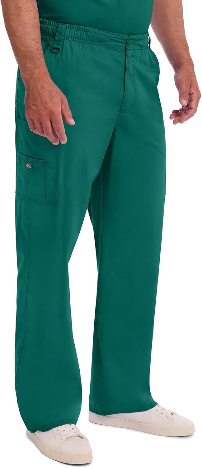 Men's zip fly pull-on pant features an all around elastic waistband with a button closure, an adjustable interior drawstring and Dickies logo twill tape on the inside back waistband. Also featured are slash pockets, cargo pockets and a back pocket with a hook and loop fastener for security, a d-ring on right front belt loop and double-needle topstitching throughout.
