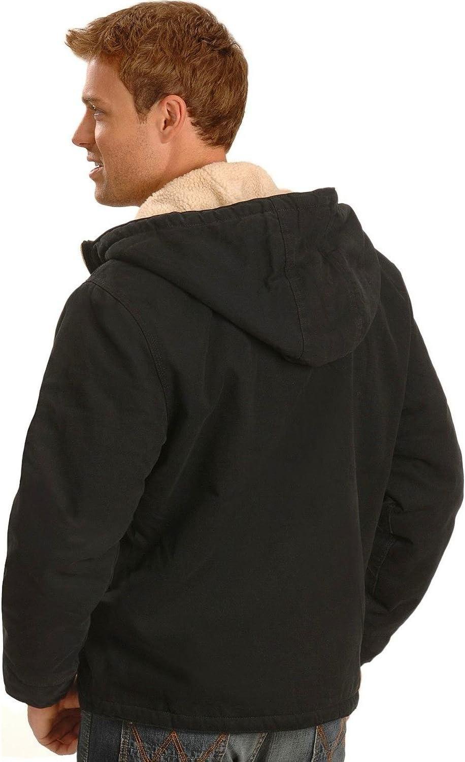 Hooded jacket features a warm sherpa lining with interior pocket and cell phone pocket. 8.5 ounce duck 100 percent cotton fabric is sanded and garment washed for your comfort. Triple needle reinforced seams for a strong and durable work jacket.