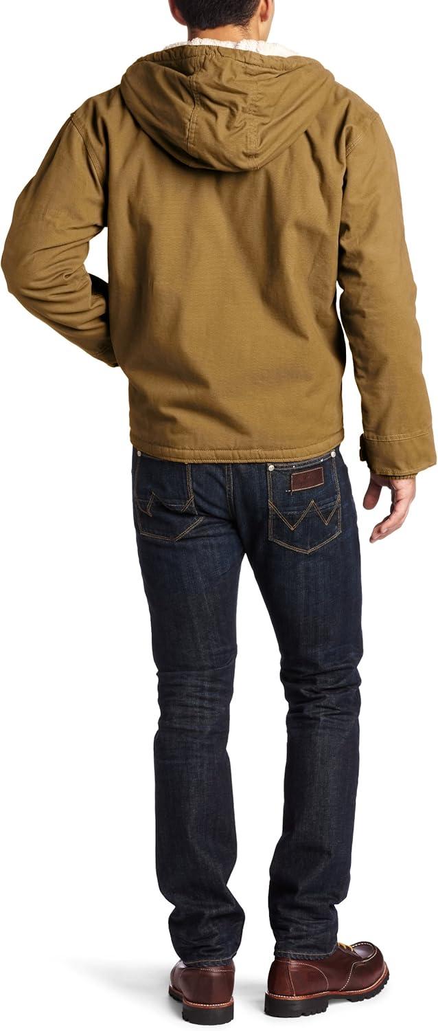Hooded jacket features a warm sherpa lining with interior pocket and cell phone pocket. 8.5 ounce duck 100 percent cotton fabric is sanded and garment washed for your comfort. Triple needle reinforced seams for a strong and durable work jacket.