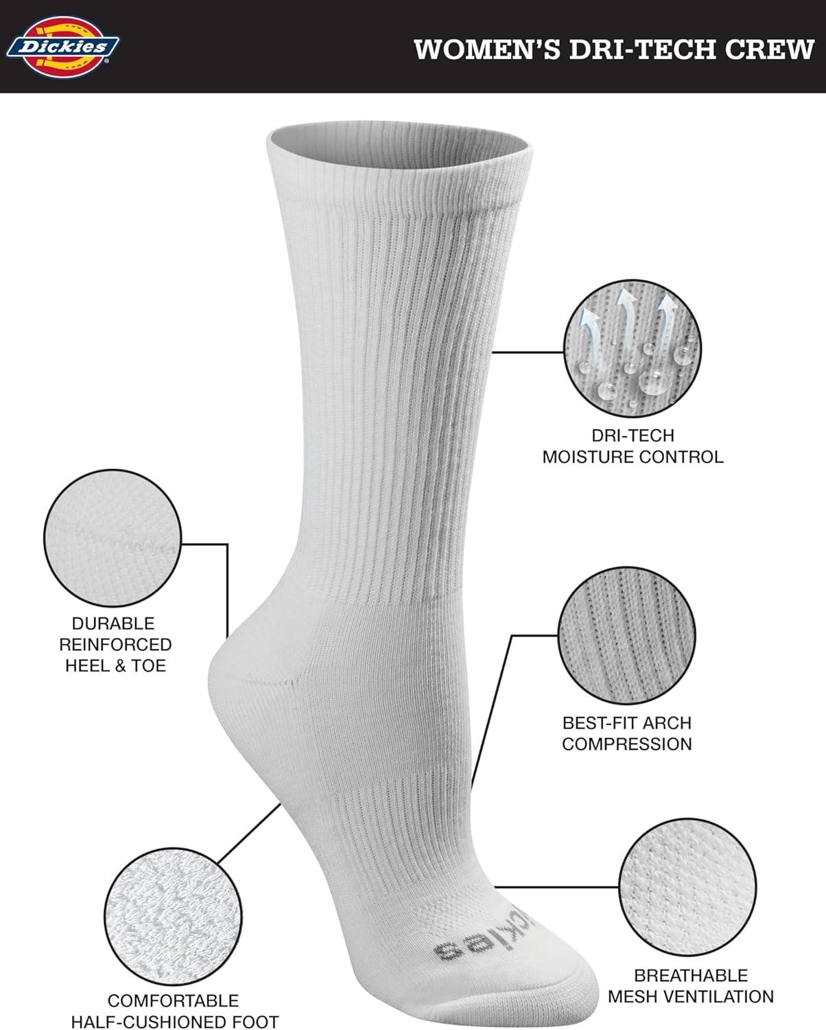 Dickies Women's Dri-Tech Essential Moisture Control Crew Socks(White Solid (6 Pairs))