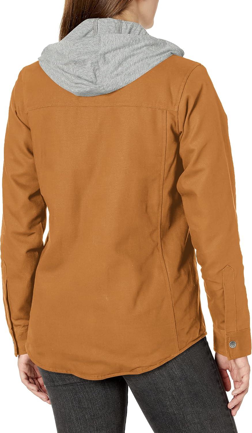 Discover the most versatile outer layer that delivers on the promise of warmth, durability and protection in Dickies Women’s Duck Hooded Shirt Jacket. Combining the lived-in feel of a hoodie, the strength of a duck canvas work shirt and the security of a jacket, this workday essential will check the box for function and style. Featuring a sturdy brushed duck canvas fabrication and equipped with a cozy jersey lining and hood, you’ll embrace the cold climate with ease in this shirt jacket. You’re covered in wet weather too, as the DWR finish ensures water repellency to keep you dry. Durable metal snap closures at front and a drop tail hem offers even more protection when your work climate calls for it. Maximum utility comes standard with two large chest pockets and two side welt pockets to store all that you carry.