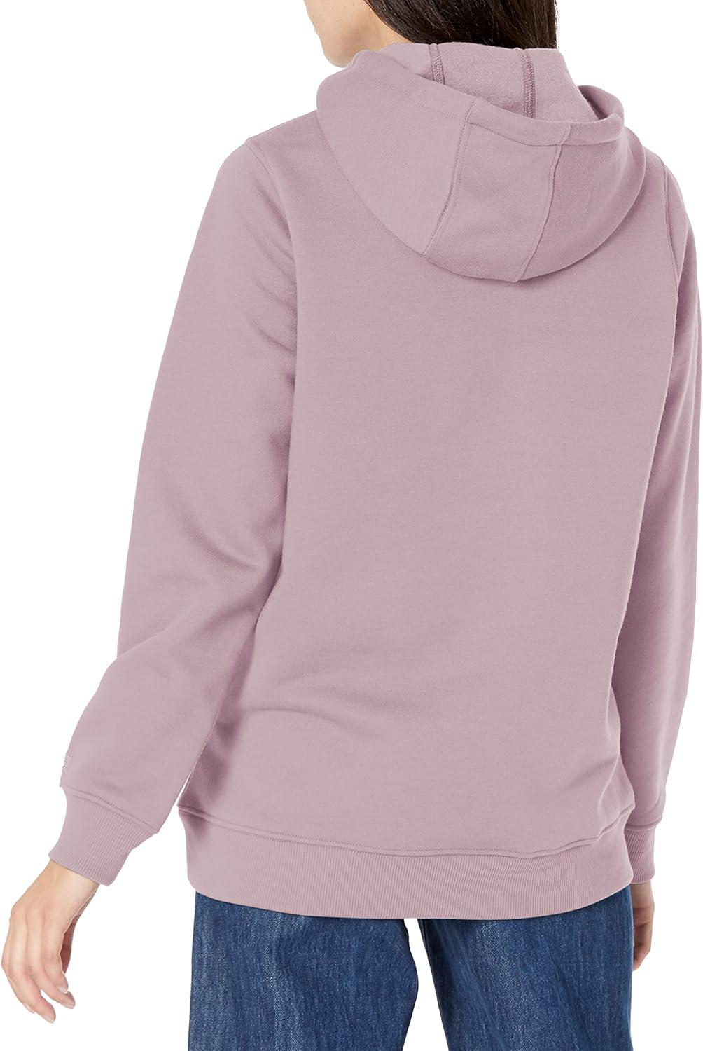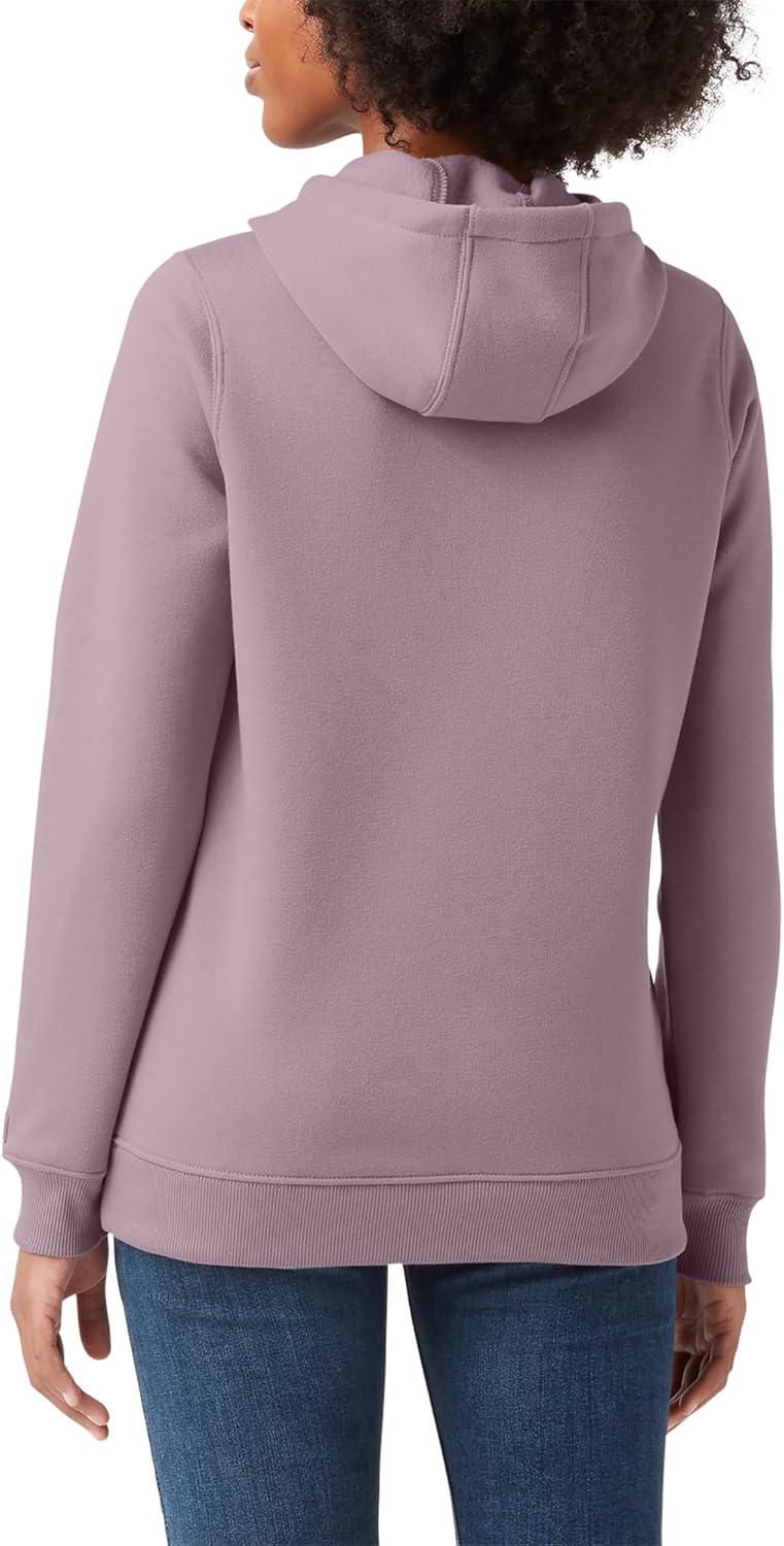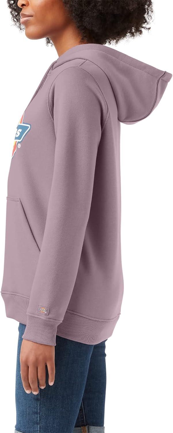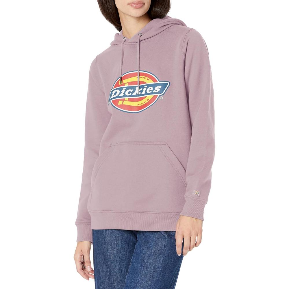 Dickies Women's Heavyweight Logo Fleece Pullover is fabricated from a soft fleece for a comfortable hand feel and primed with reinforced double needle stitching at the seams. The Durable Water Repellent finish enables this hoodie to be put to work in wet conditions. Equipped with a crossover neckline, three-piece adjustable hood and rib knit waist and cuffs, you'll be sure to keep the elements out while you perform in ultimate comfort. There is no shortage of layering potential with this hoodie, a true wardrobe staple that outlasts every season. The kangaroo pocket at front provides added utility to store small gear, or to quickly warm your hands while on the go. Complete with a Dickies traditional tri-color logo graphic, there's no denying your devotion to protective and performance driven workwear.