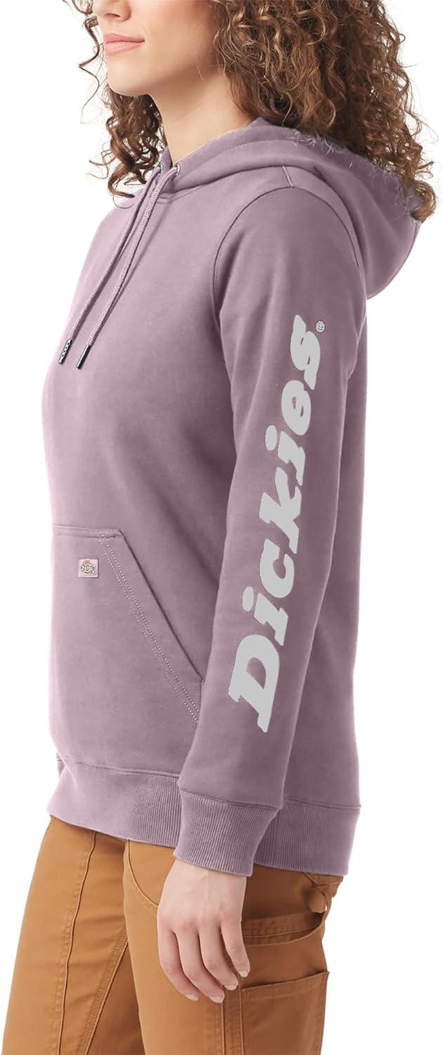 Dickies Women's Heavyweight Wordmark Fleece Pullover is constructed from a soft fleece for a comfortable hand feel. Double needle stitching provides added strength, while the Durable Water Repellent finish enables this hoodie to be put to work in wet conditions. Equipped with a crossover neckline, three-piece adjustable hood and rib knit waist and cuffs, you'll be sure to keep the elements out while you perform in ultimate comfort. There is no shortage of layering potential with this hoodie, a true wardrobe staple that outlasts every season. The kangaroo pocket at front provides added utility to store small gear, or to quickly warm your hands while on the go. Complete with a left sleeve Dickies graphic, there's no denying your devotion to protective and performance driven workwear.