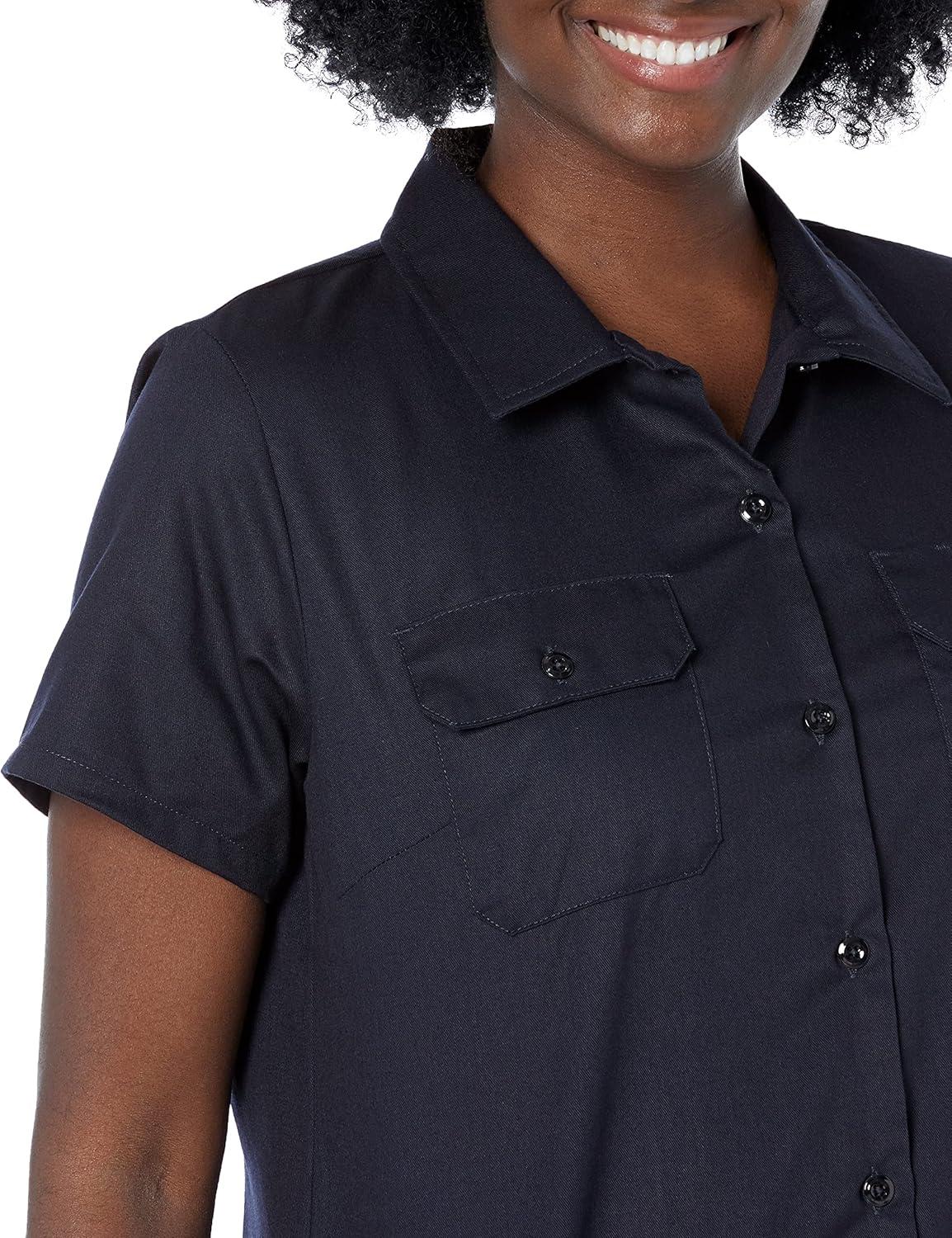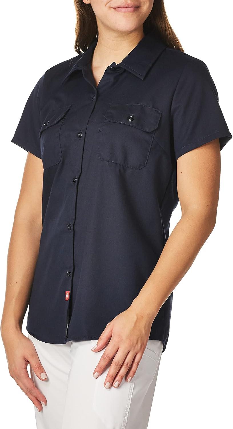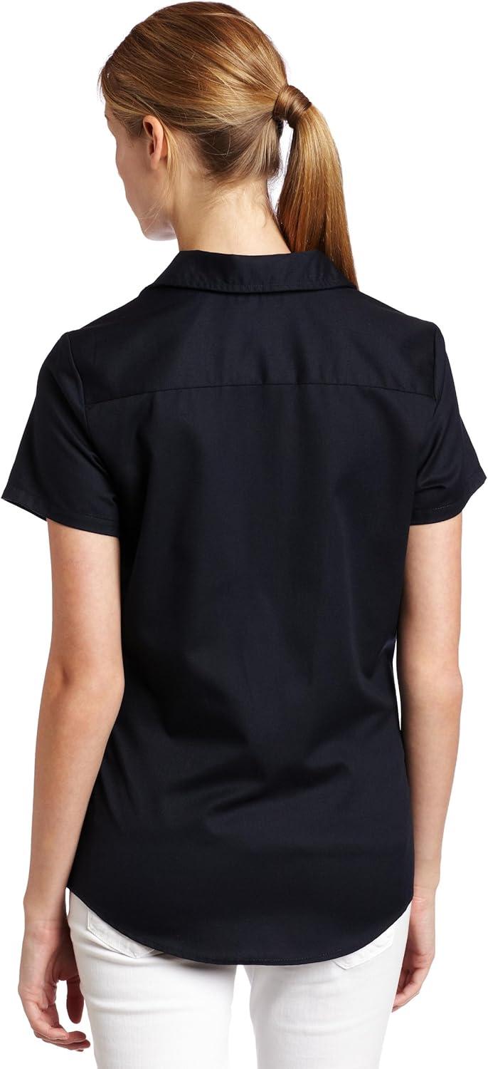 Dickies women's short sleeve original fit work shirt. same detailing as our men's work shirt, but made to a fit a women in 5.5 oz 65% polyester/35% cotton twill blend fabric. front darts for fit and back yoke for movement. performance features include stain release, wrinkle resistant, and garment washed for softness