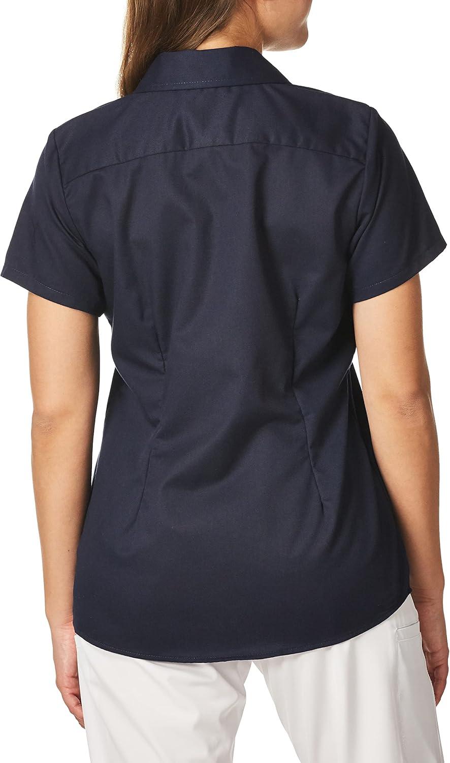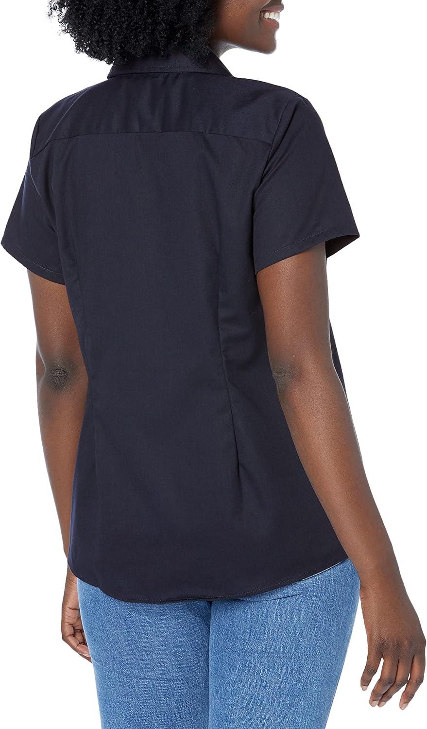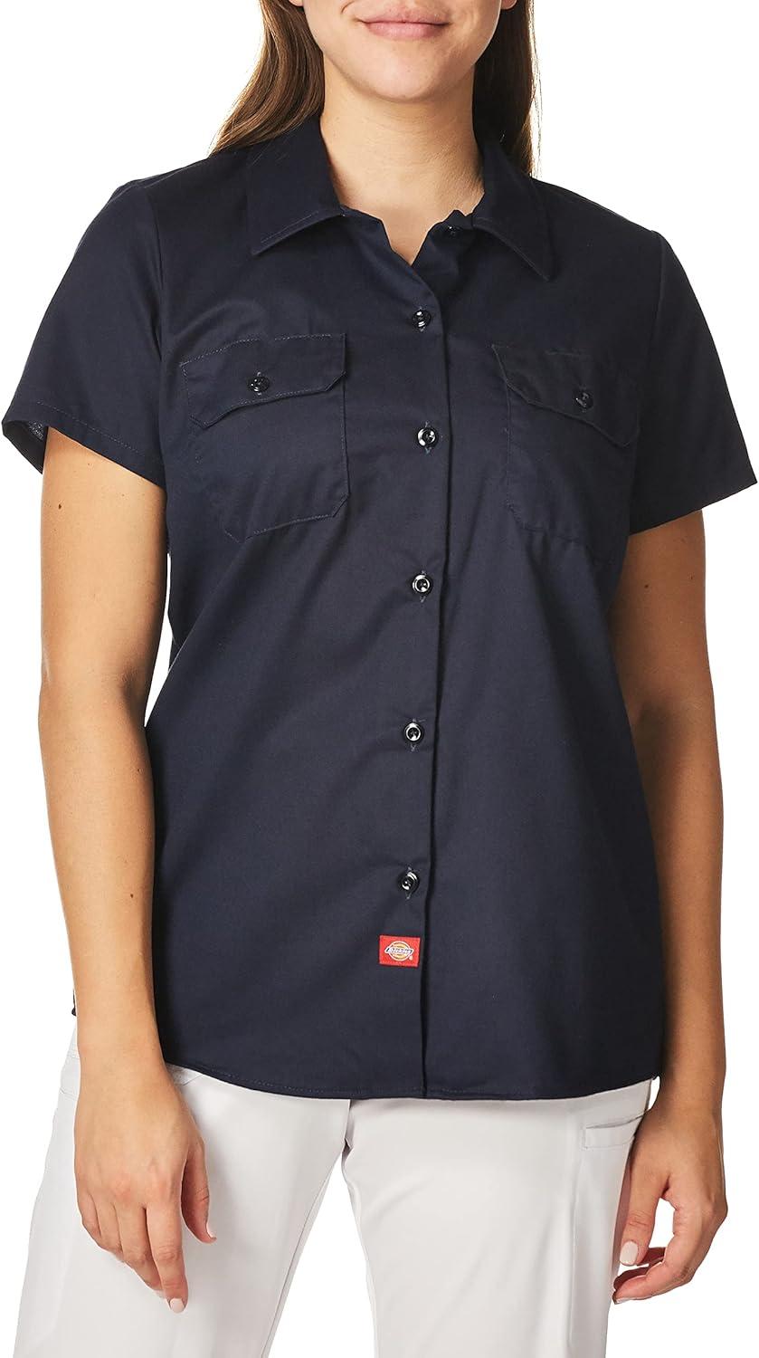 Dickies women's short sleeve original fit work shirt. same detailing as our men's work shirt, but made to a fit a women in 5.5 oz 65% polyester/35% cotton twill blend fabric. front darts for fit and back yoke for movement. performance features include stain release, wrinkle resistant, and garment washed for softness
