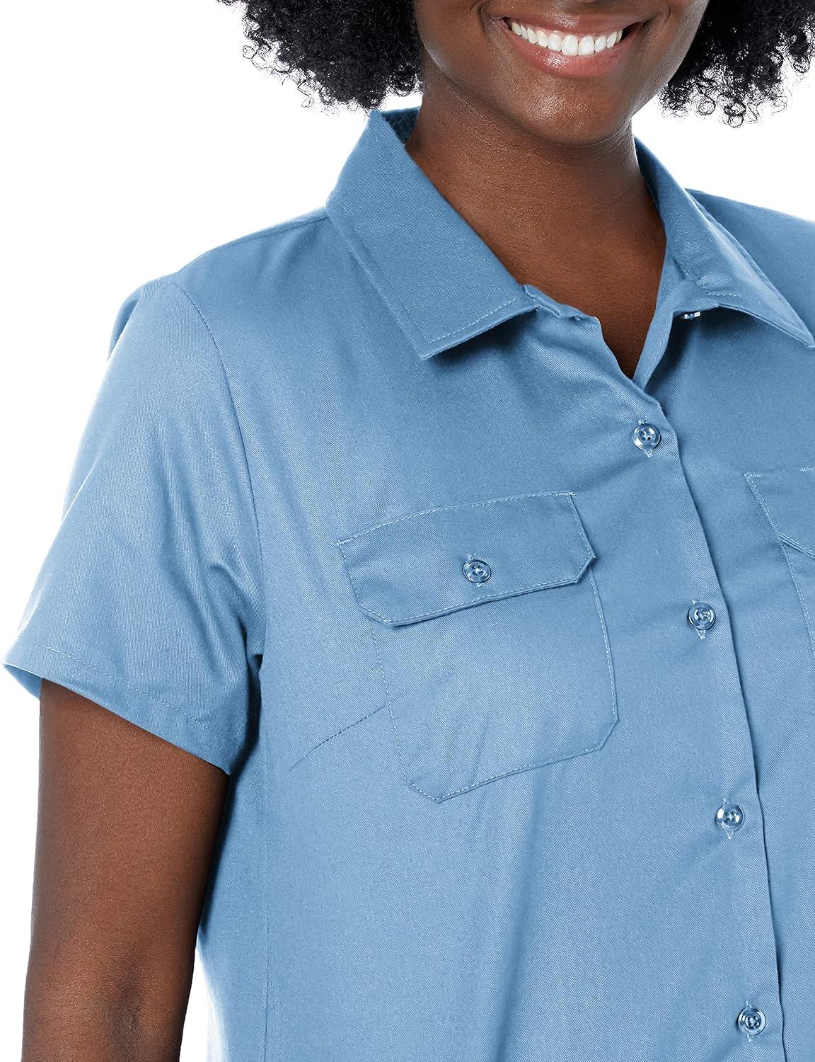 Dickies women's short sleeve original fit work shirt. same detailing as our men's work shirt, but made to a fit a women in 5.5 oz 65% polyester/35% cotton twill blend fabric. front darts for fit and back yoke for movement. performance features include stain release, wrinkle resistant, and garment washed for softness