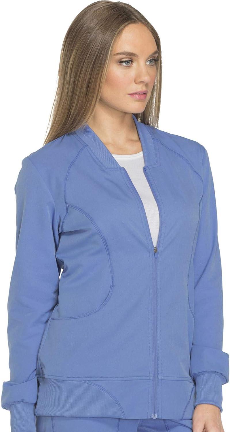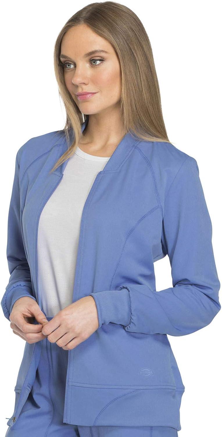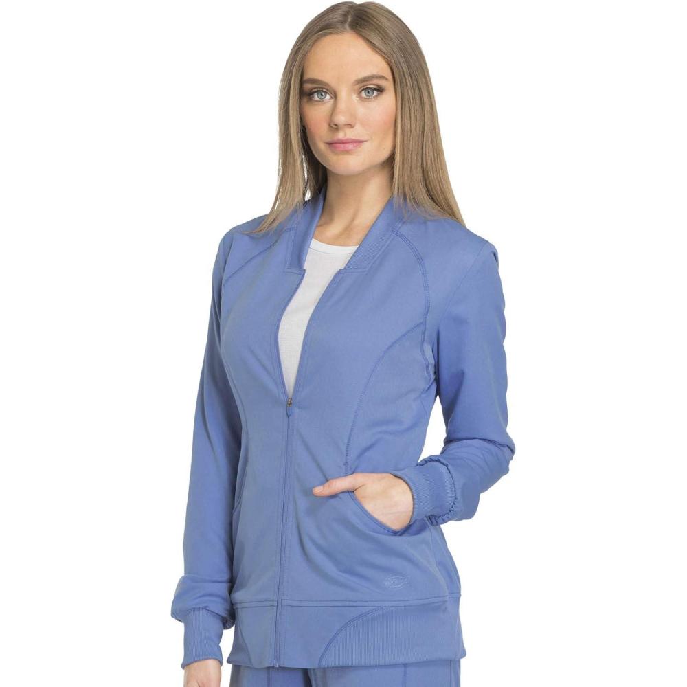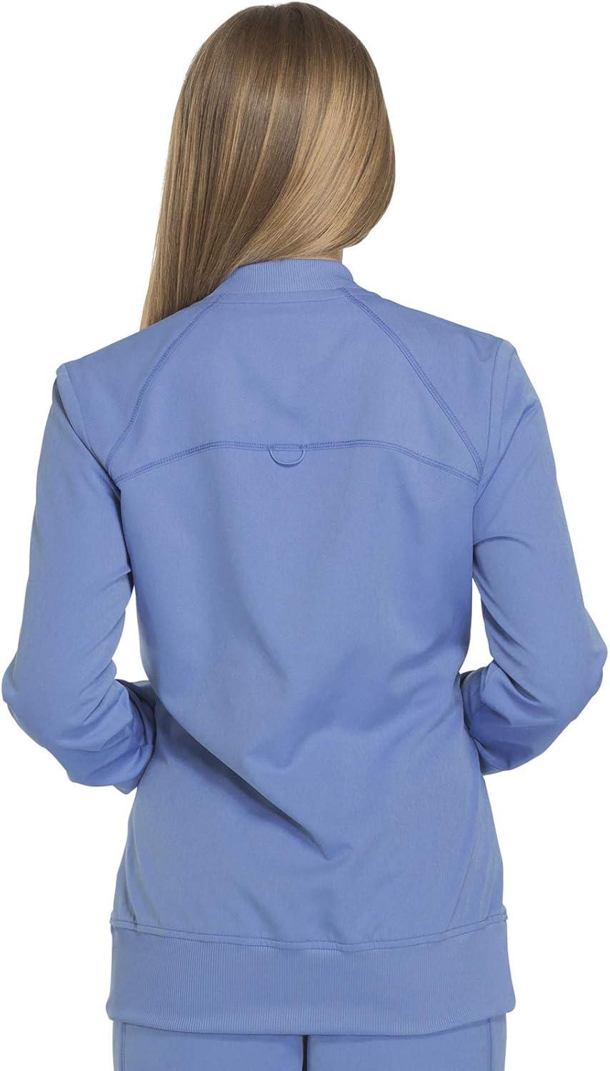 Athletic-Inspired Dickies Medical Women Scrubs | Advanced Fabric and Features Womens scrubs enter a new era of sport performance with Dickies Dynamix. This womens light jacket mixes elevated functionality with our favorite athletic features. Light polyester/spandex fabric blend and textured dobby construction was inspired by sports apparel. Front and back shoulder yokes plus front seaming for fit and shaping. Back yoke with locker loop. Two front in-seam pockets to store your stuff. Right front pocket features a cool tech upgrade: Grommet inside pocket creates a cable management system for your headphones. Route the headphone cables through the grommet and under your Dynamix scrub jacket to keep you wired in and tangle free during break time. Dyed-to-match rib-knit neck band, cuffs and waistband. Coverstitch detail throughout jacket provides extra athletic appeal. Discrete tonal logo heat transfer on left pocket. Heat transfer neck label for comfort. Whether you're looking for scrub jackets or workout jackets for women, we have you covered. For a lightweight jacket women will love, shop the entire Dickies Dynamix collection. Dickies Dynamix: Inspired by sport, designed for the way you work. Contemporary fit. Moisture wicking finish moves moisture away from the body to keep you comfortable through a long work shift. Wrinkle resistant. Body: 91% polyester / 9% spandex textured dobby Rib-knit trim: 96% polyester / 4% spandex Center back length (size S): 25 ½”